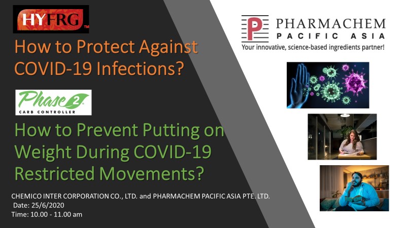 PHARMACHEM PACIFIC ASIA Pte. Ltd., Singapore in collaboration with Chemico Inter Corporation Co., Ltd. jointly organized a webinar entitled “HYFRG™ (Fermented Red Ginseng): How to Protect Against COVID-19 Infections?” and “Phase2® (White Kidney Bean Extract): How to Prevent Putting on Weight During This COVID-19 Restricted Movements?” on June 25, 2020. The webinar provided product information, health benefits, clinical studies and their applications with market product samples which can help in the development of new products in food and dietary supplement.