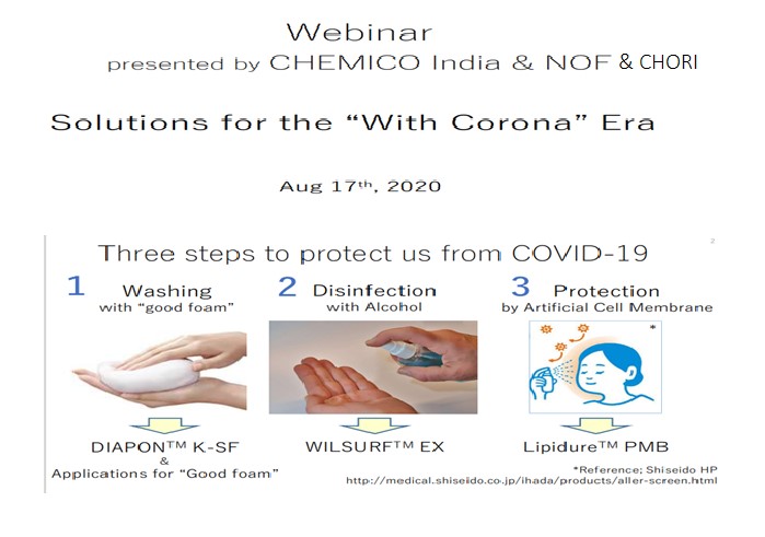 NOF Corporation and Chori Co., Ltd. in collaboration with Chemico Health and Beauty India Private Limited. held an online webinar on August 17th, 2020 under the topic “Solutions for the “with Corona” Era”.