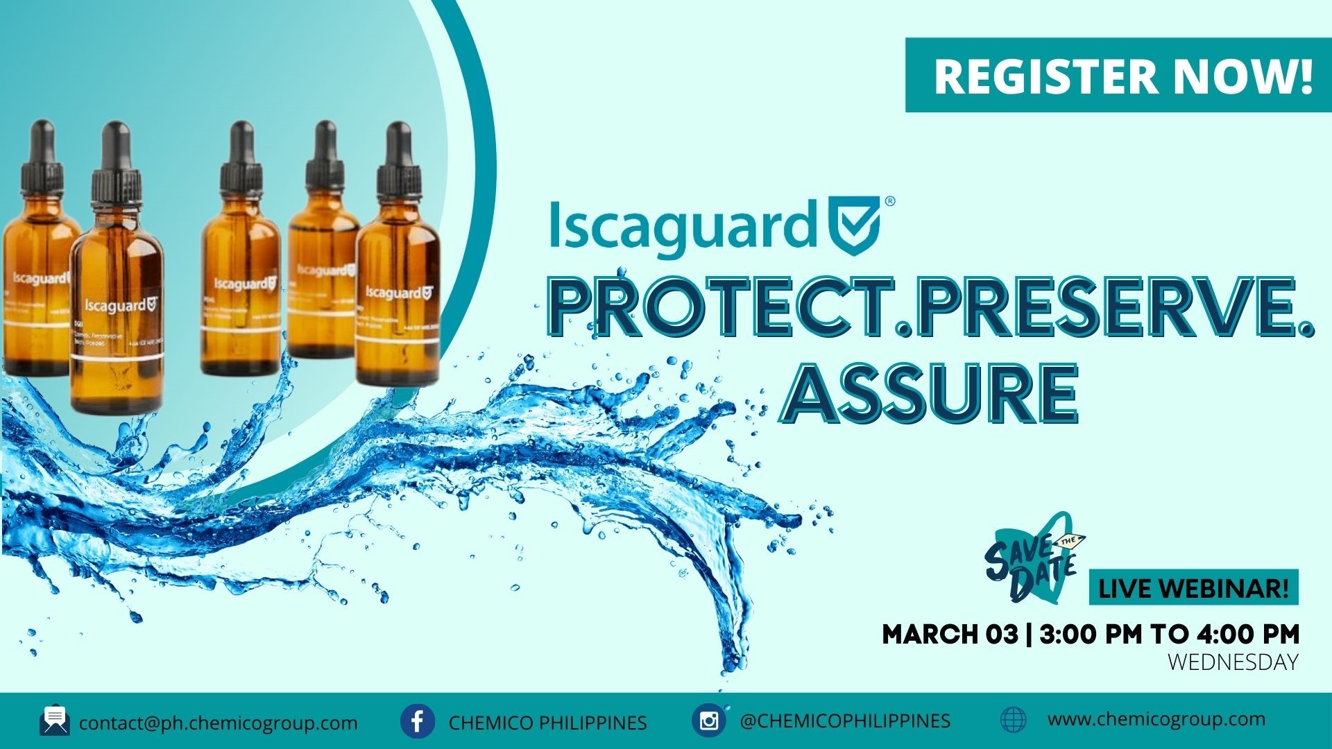 ISCA UK Ltd. in collaboration with Chemico Philippines, Inc. held an online seminar entitled “Iscaguard Protect. Preserve. Assure.” on March 03, 2021. The webinar started with company profile, followed by the latest trends of preservation system, the demand of anti-bacterial and anti-viral claims during the COVID-19 pandemic in cosmetics and Iscaguard products that perfect fit for these demands.
