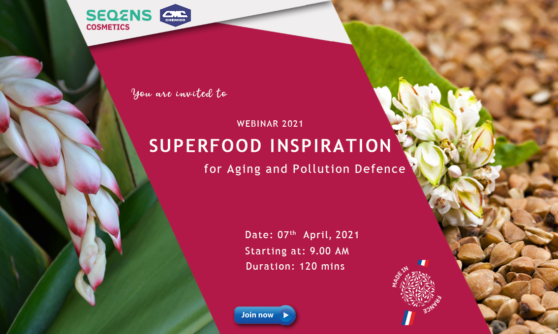 Chemico Vietnam x Seqens held a joyful webinar on 07th April 2021 with the topic “Superfood inspiration for Aging and Pollution Defense”. The presentation was followed by the botanical and Expo Biota trends. Such ingredients could help maintain our skin from the bad effect of polluted environment. Keeping your body and skin healthy is a must-do thing nowadays. Through the webinar, the customers were made acquaintance with these new ingredients with the most exciting visual.
