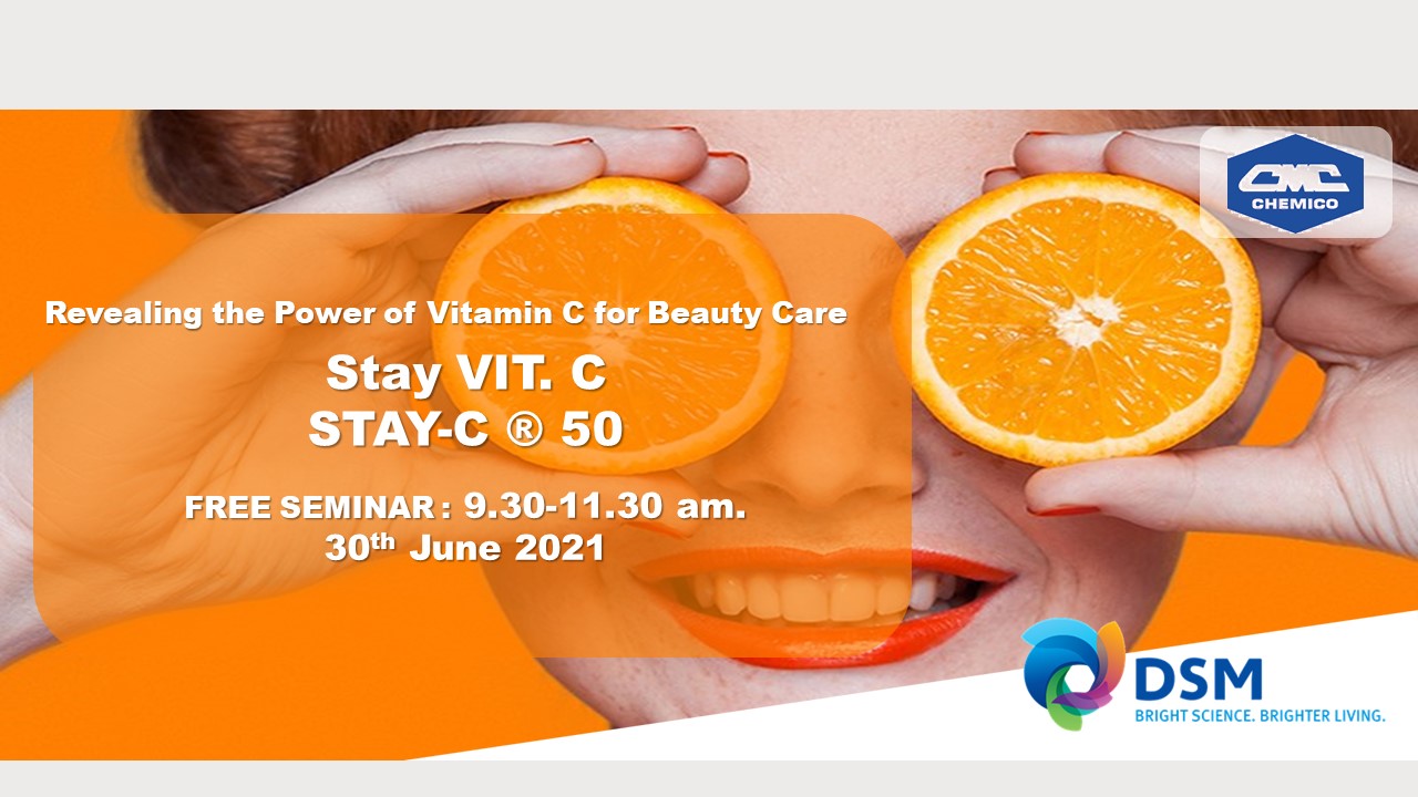 DSM Nutritional Products (Personal Care) in collaboration with Chemico Inter Corporation Co., Ltd. held a webinar entitled "Revealing the Power of Vitamin C for Beauty Care" on June 30, 2021. The webinar focused on STAY-C® 50, the vitamin C derivative with powerful efficacy and superior stability in formulations compared to the other forms of Vitamin C. The product trend with Vitamin C was shared with the attendees as well.