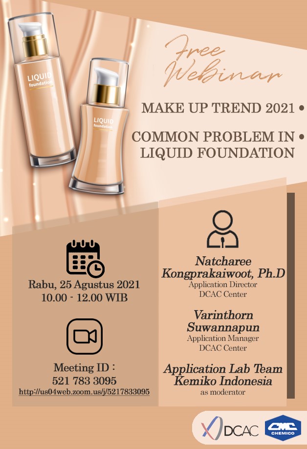DCAC Center, in collaboration with PT. Kemiko Indonesia, Jakarta held a webinar entitle “Make Up Trend 2021 and Common Problem in Liquid Foundation” on August 25, 2021.