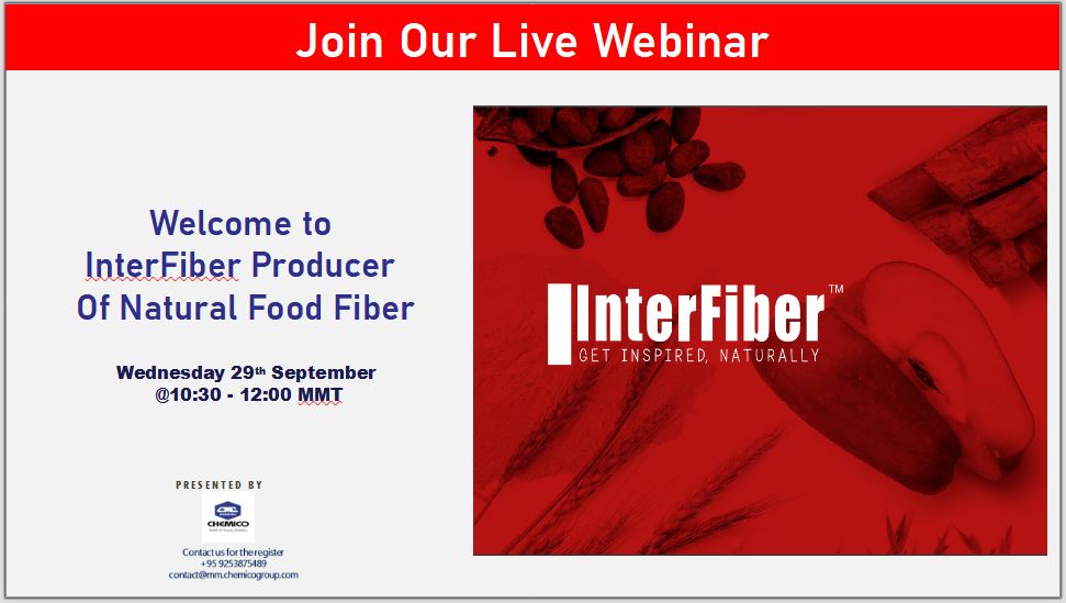 Chemico Myanmar Co., Ltd. together with InterFiber Asia Pacific Ltd. organized a webinar about natural food fiber for food application on September 29th, 2021 under the title “InterFiber: Get Inspired Naturally”. The webinar presented introduction to the company, information of fiber products for food application as well as raw materials that used in bakery and processed meat products. Participants were interested in producing healthier products in their future plans.