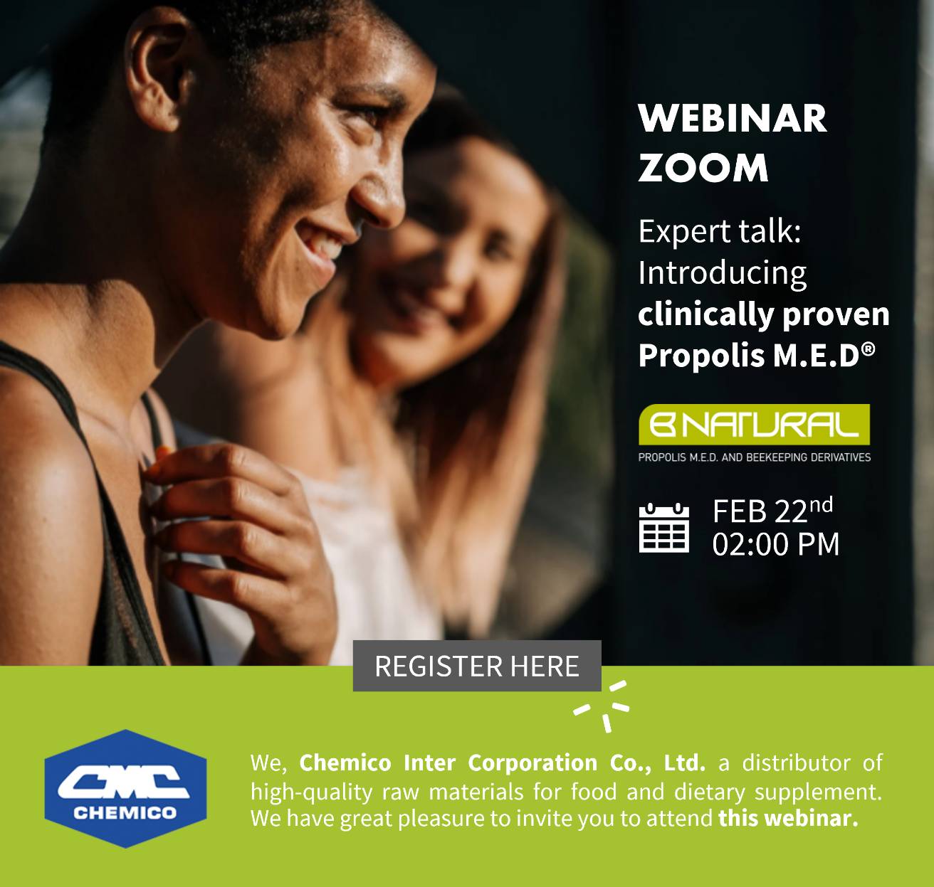 B Natural S.R.L., Italy in collaboration with Chemico Inter Corporation Co., Ltd. organized a webinar entitled “Propolis M.E.D.®: a clinically proven ingredient supporting the immune system” on February 22nd, 2022. The webinar provided B Natural and Propolis M.E.D.® introduction, scientific data, clinical data, finished product examples as well as solubility test and applications of Propolis Dry Extract ESIT 3. These information is very useful in the development of new products in the field of dietary supplement.