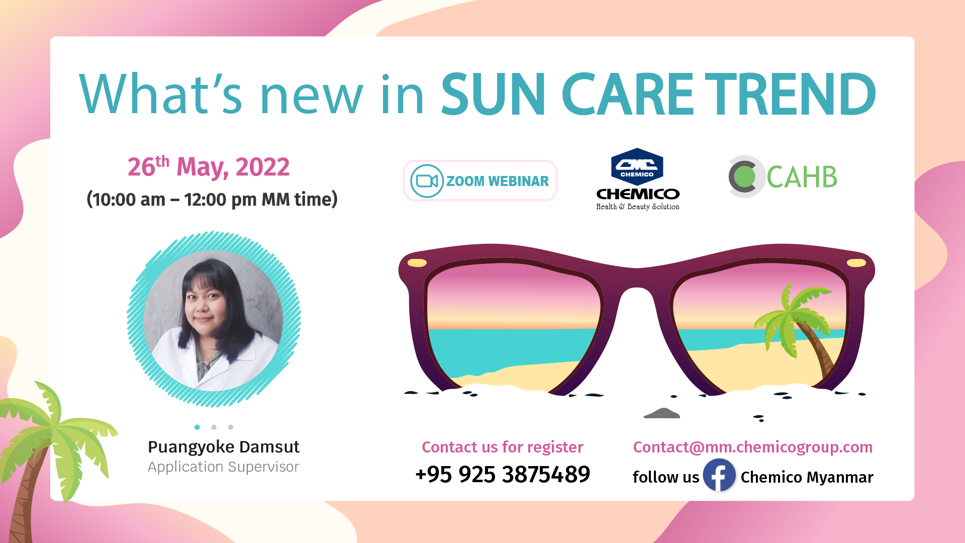 Chemico Myanmar Co., Ltd. together with Chemico Asia Health and Beauty (CAHB) Center held an interesting webinar for Myanmar customers entitled “What’s new in SUN CARE TREND” on May 26, 2022. This webinar focused on Sun Care Trend in 2022, and we presented sun care formulations related with trend as well. Attendees were interested and participated in Q&A, survey and sample request sessions. We will prepare requested samples and distribute upon customer request.