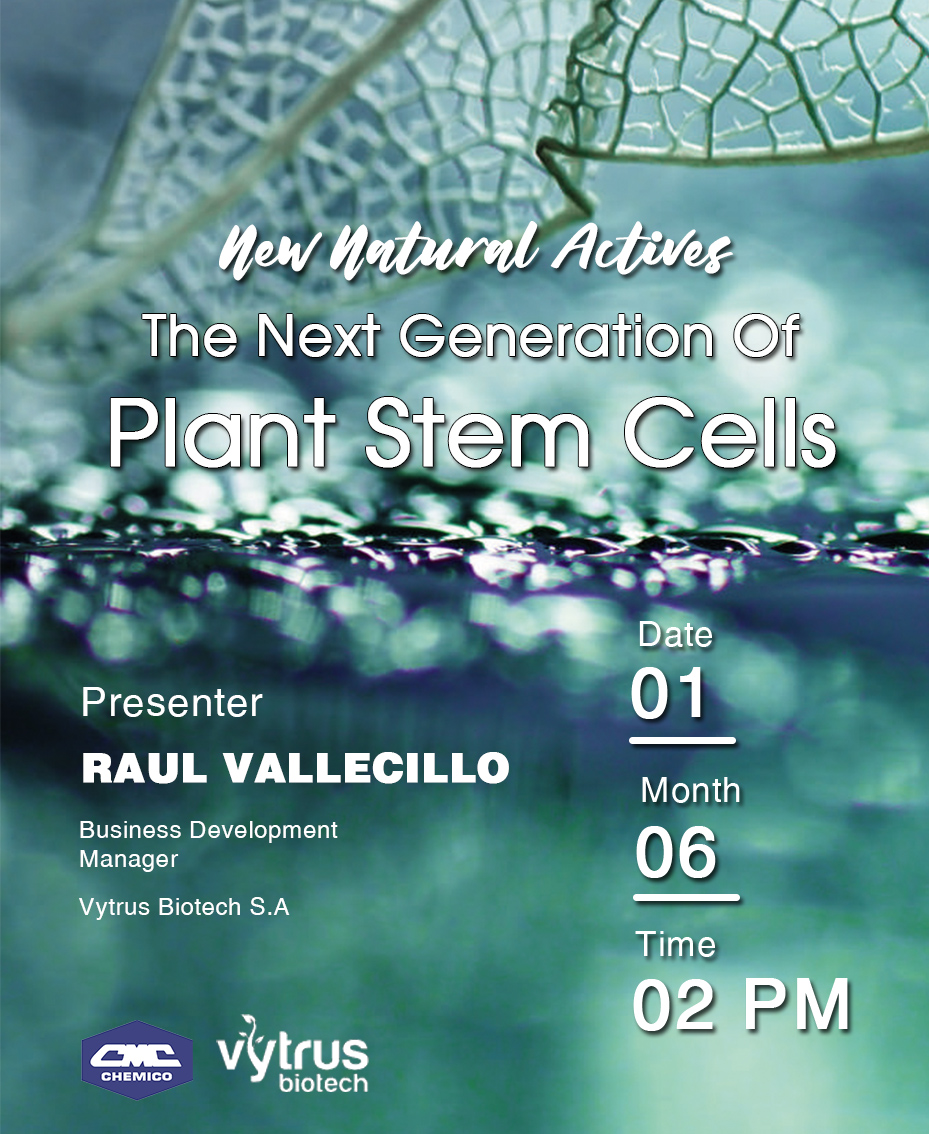 Recently, plant-based ingredients and plant stem cells become very popular in skin care products. Many famous brands also catch up with these trends. So, Vytrus Biotech in collaboration with Chemico Vietnam Co., Ltd. held a webinar on June 01st, 2022 under the topic “New Natural Actives - The Next Generation Of Plant Stem Cells”. It was an amazing webinar about the plant stem cells products in Vietnam market.