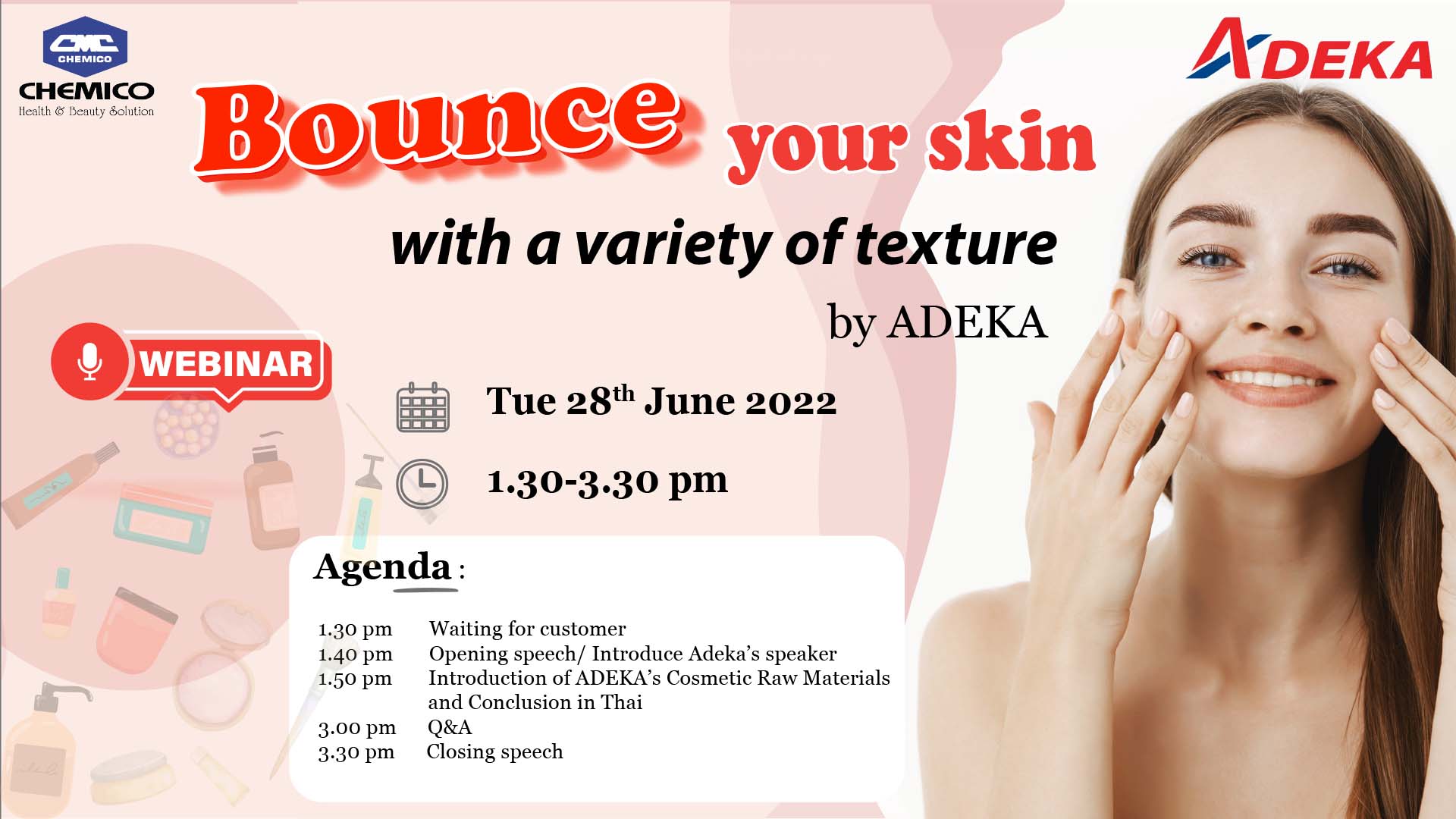 Adeka Corporation, Japan in collaboration with Chemico Inter Corporation Co., Ltd., Thailand held a webinar for Thai customers entitled "Bounce Your Skin with a Variety of Texture by ADEKA" on June 28, 2022. The webinar presented Market Trend and also focused on Rheology Modifiers, Texture Modifiers, Multi-Functional Glycols and Emollient Agents. Furthermore, several formulas contained these ingredients were introduced during the webinar.