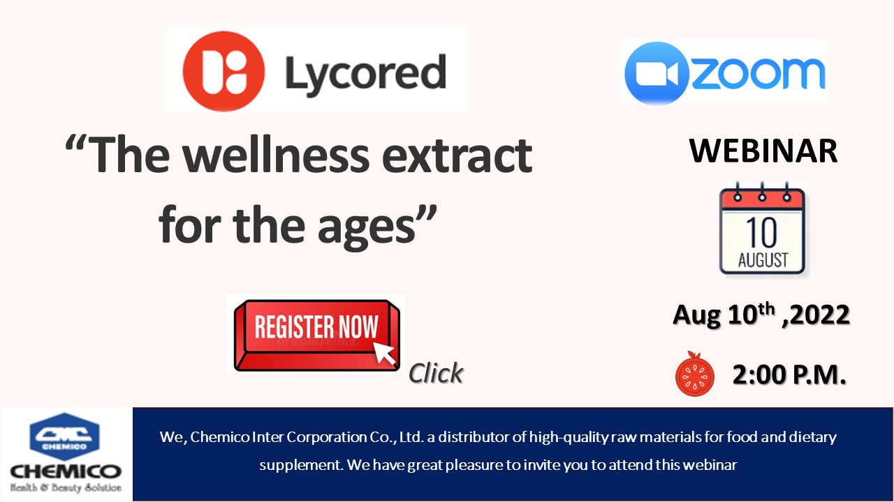 Lycored Ltd., Israel, in collaboration with Chemico Inter Corporation Co., Ltd., Thailand organized a webinar entitled “The Wellness Extract for the Ages” on August 10th, 2022. The webinar provided Lycored company introduction, Lycored tomato extract’s scientific & clinical data for beauty and wellness as well as its solubility test and applications. The information is very useful in the development of new products in the field of dietary supplement, food and beverage.