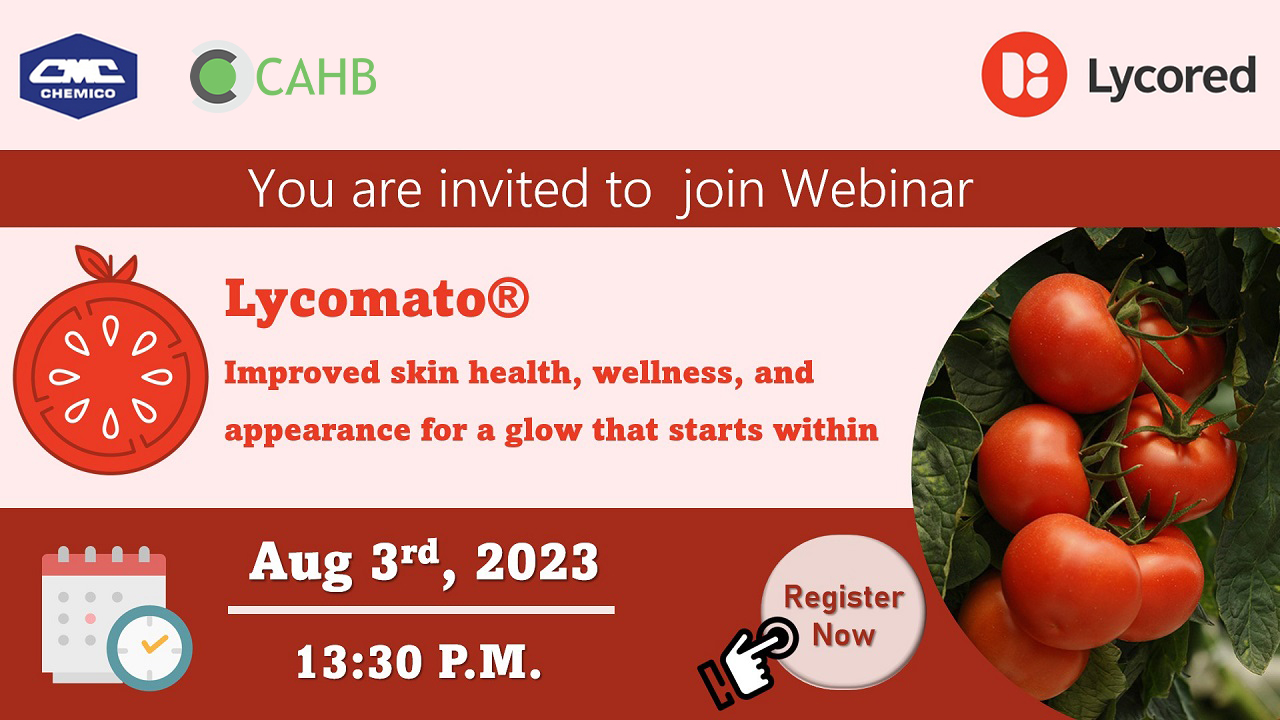 Lycored Ltd., Israel in collaboration with Chemico Inter Corporation Co., Ltd., Thailand organized a webinar entitled “Lycomato® Improved Skin Health, Wellness, and Appearance for a Glow that Starts Within” on August 3rd, 2023. The webinar provided Lycored introduction, Lycomato® information, clinical studies for skin health, skin appearance and sun care + environmental stress as well as product properties and applications. The information is very useful in the development of new products in the field of dietary supplements (i.e. soft gel, hard capsule, tablet, gummy jelly, jelly strip, powder drink).