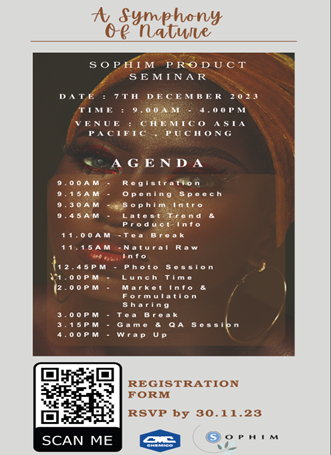 Sophim, France and Chemico Asia Pacific (Malaysia) Sdn. Bhd., organised a  seminar on December 7th, 2023 at Chemico Asia Pacific (Malaysia) seminar room. The presentation included information about Phytosqualan and the new ingredient - Phytolive Fine (a natural alternative to plastic scrub beads) to upgrade the cosmetic products and shared about the uniqueness of scrub to improve excellent cleansing on the skin. The current market trends and success products of using Sophim ingredients were presented to the customers as well.