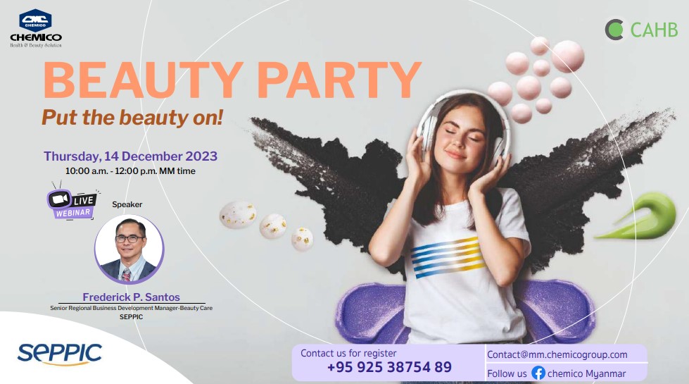 Seppic Inc. in collaboration with Chemico Myanmar Co.,Ltd. organized an interesting webinar under the topic “Beauty Party Webinar“ on December 14th, 2023. The webinar presented about Enjoy music with cosmetics, Main ingredients in Mask, shower, lotion and cream formulations, Formulation tips and Information of raw materials. All prototypes were sent to the registered customer for testing before the webinar. Attendees were interesting in the prototypes and participated in Q&A and sample request section too.