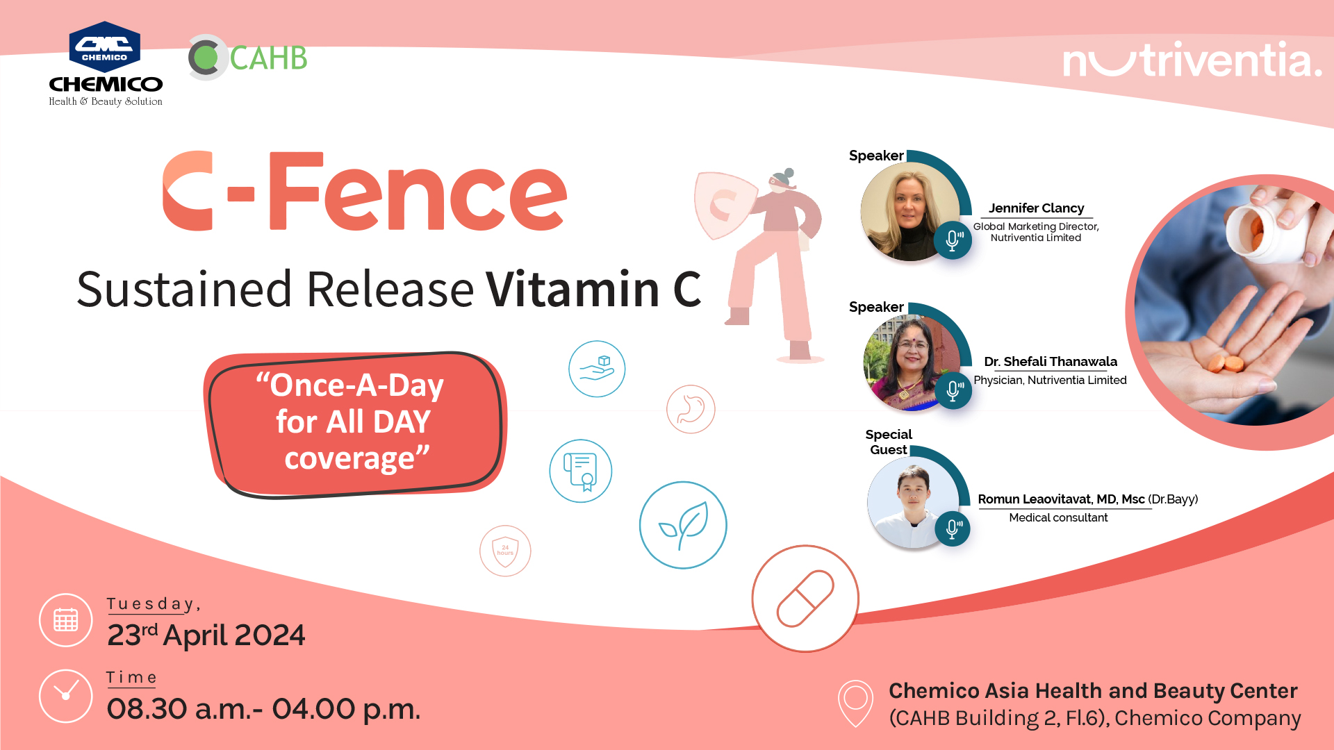 Nutriventia Limited, India in collaboration with Chemico Inter Corporation Co., Ltd., Thailand organized a seminar entitled “C-Fence: Sustained Release Vitamin C, Once-A-Day for All DAY Coverage” on April 23rd, 2024 at Chemico Asia Health and Beauty (CAHB) center, Thailand. The seminar provided vitamin C information (general knowledge, pharmacokinetics and the related research), C-Fence™information, clinical studies, market trends, regulatory information and tablet manufacturing guidelines. The information is very useful in the development of new products in the field of dietary supplement products (direct compression tablet).