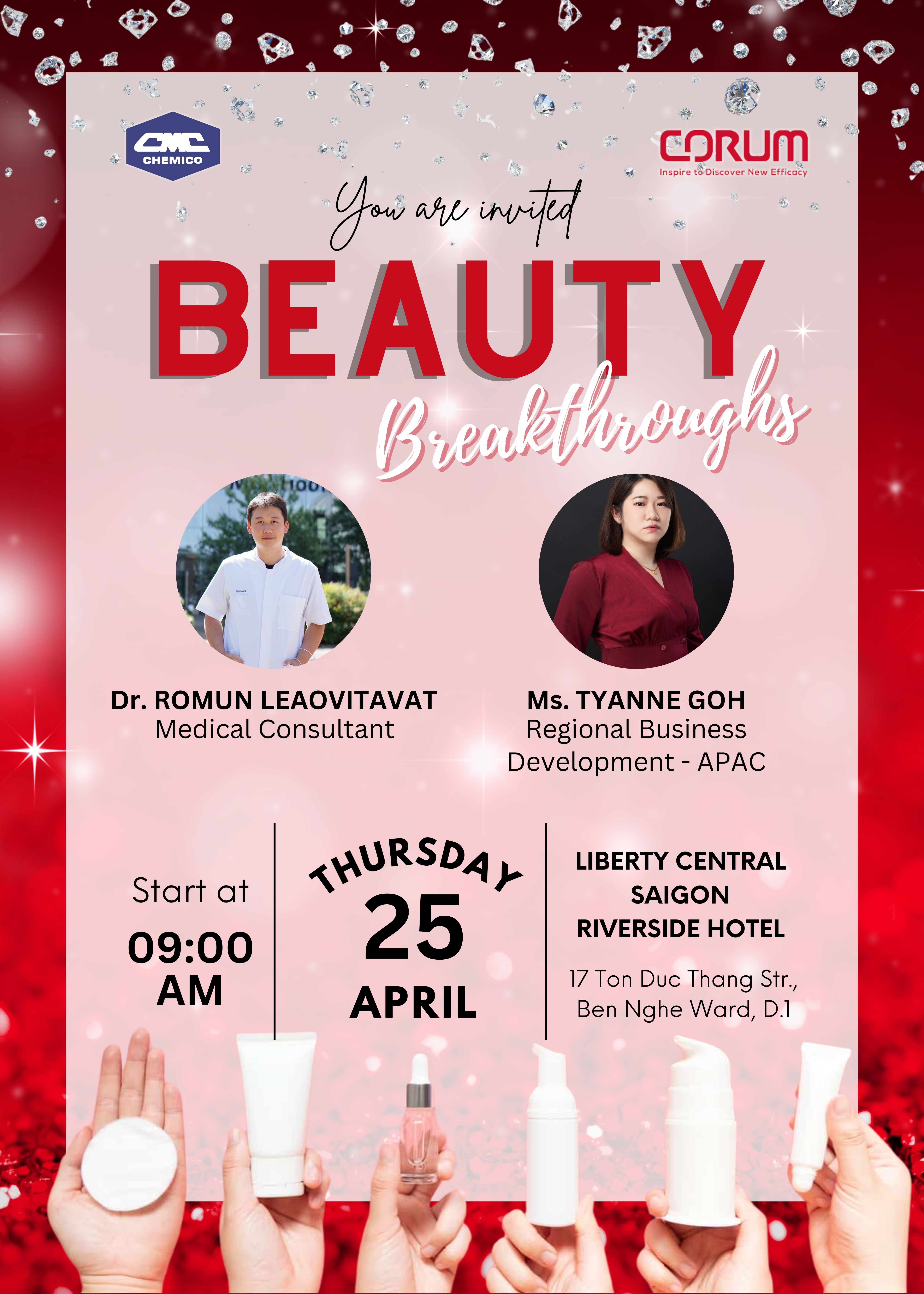 Corum Inc., Taiwan in collaboration with Chemico Vietnam Co., Ltd. held a big Seminar 2024 at Liberty Central Sài Gòn Riverside Hotel, District 1 on April 25th, 2024. The topic was “BEAUTY BREAKTHROUGHS”. The seminar was all about the advanced Skincare ingredients for whitening, acne and anti-aging products from Corum Inc. and Skin structure presented by Dr. Romun Leaovitavat – the Medical Consultant. The ingredients, Genowhite, Et-VC, IP-VC, Azeclair, Azeclair P, C-pep series and Epi-On, were introduced during the theory part together with latest beauty trends and prototypes developed by Corum Inc. and Chemico Vietnam Application center.