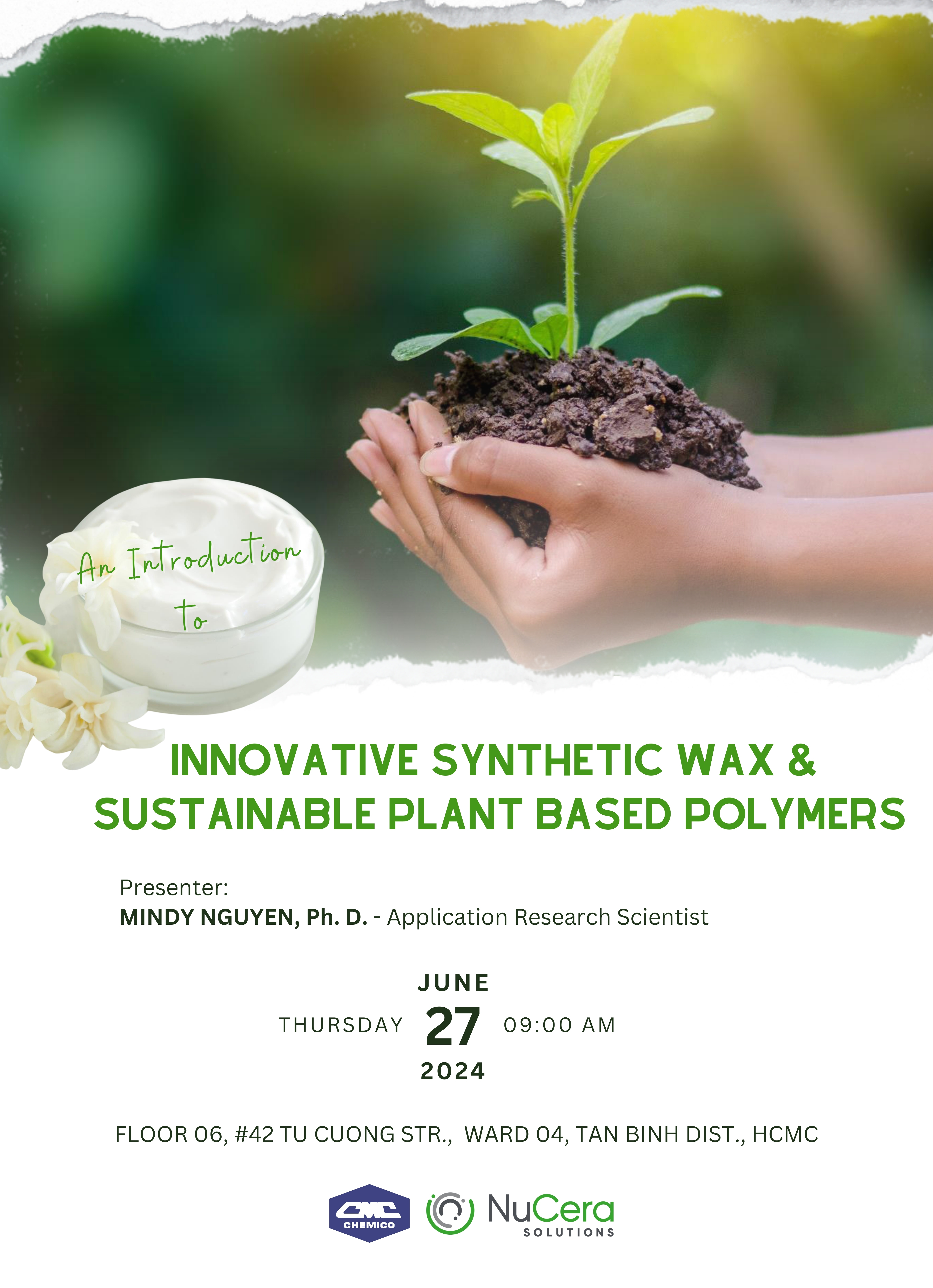 NuCera Solutions LLC. in collaboration with Chemico Vietnam Co., Ltd. held a seminar under the topic “An Introduction to Innovative Synthetic Wax & Sustainable Plant-Based Polymers” on June 27th, 2024. The seminar was about synthetic waxes with different melting temperatures and natural waxes followed the sustainable trends for skin care and make up products. During the theory part, the participants had tried the prototypes containing different amounts of these waxes developed by Chemico Vietnam Application team. And, in the workshop part, the customers had done the trial of lipstick and cleansing balm formulations.