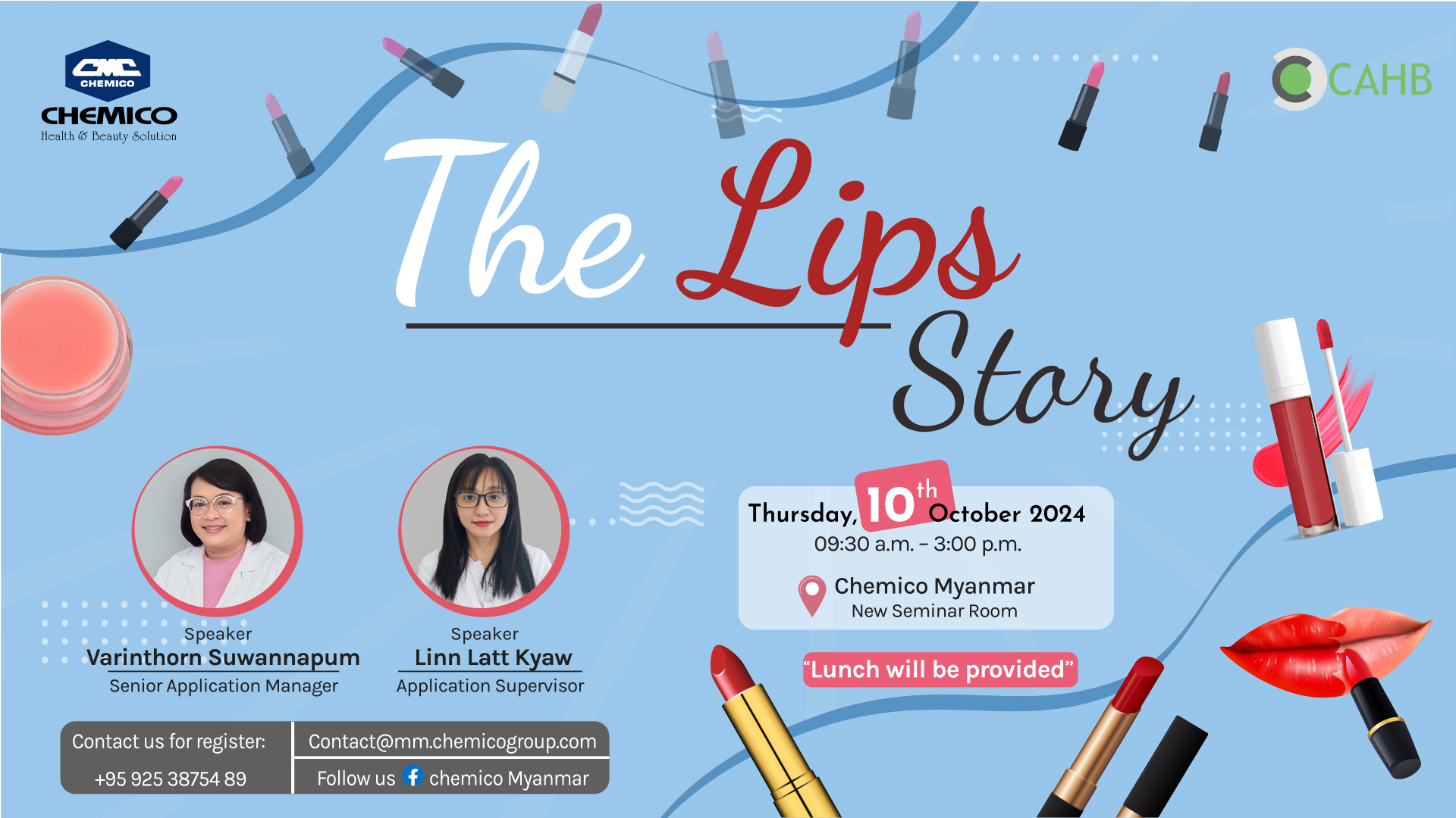 Chemico Myanmar Co., Ltd. in collaboration with CAHB center, Thailand organized a color cosmetics seminar at the new Chemico Myanmar seminar room on October 10th, 2024. The topic was “The Lips Story.” The seminar was about how to make lip products, common problems and solutions for lip product manufacturing. The key ingredients for lip product formulations were presented as well. Various type of emollients and interesting formulations were passed around to the customers to try during this section. Demonstration of formulation were also included in this seminar.