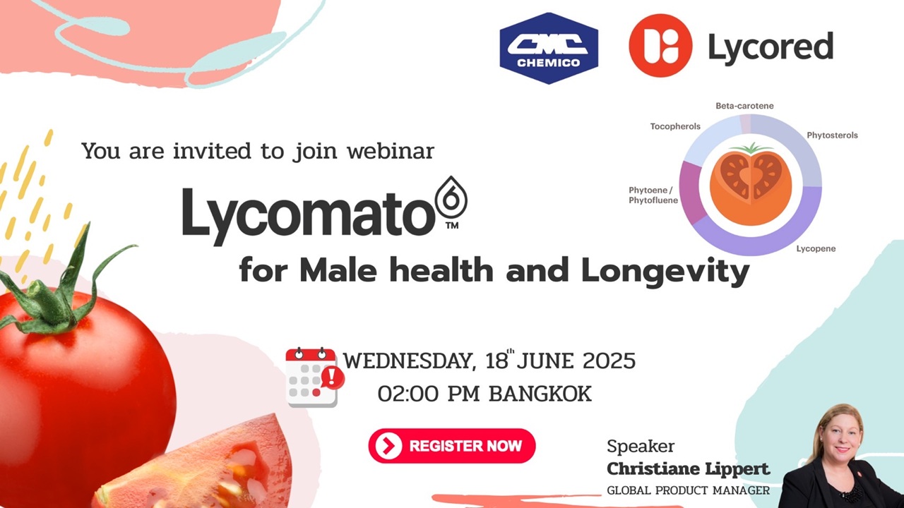 Lycored Ltd., Israel in collaboration with Chemico Inter Corporation Co., Ltd., Thailand organized a webinar entitled “Lycomato6 ™ for Male Health and Longevity” on June 18th, 2025. The webinar provided the following contents: Lycomato6 - the anti-inflammaging & longevity superhero, clinical studies for cellular health, heart health and men’s health, application aspects, relevant trends, product registration, product properties and applications. The information is very useful in the development of new products in the field of dietary supplements (capsule, softgel, powder drink, tablet, gummy jelly, jelly strip), beverage (powder drink) and coffee.