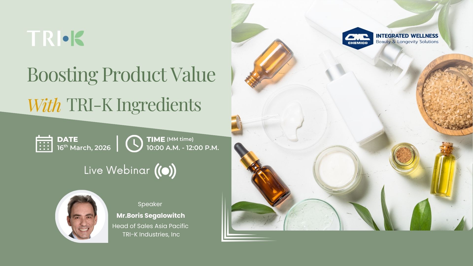 TRI-K Industries, Inc. in collaboration with Chemico Myanmar Co., Ltd., Myanmar organized a webinar on March 16th, 2026 under the title “Boosting Product Value with TRI-K ingredients.” The interesting information of ingredients related to the current market trend was shared, and the formulations containing TRI-K ingredients were also presented during the webinar.